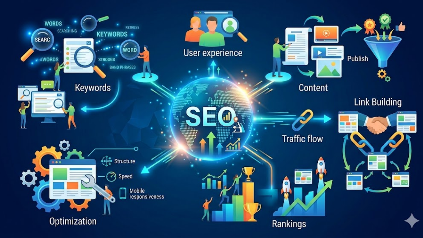 SEO MARKETING Search Engine Optimization or SEO is not about using keywords. It is about making a website that people like to visit. We use a plan that is based on data to make sure your website is not on the first page of search engines but also easy to use. This way people who visit your website will become your customers.